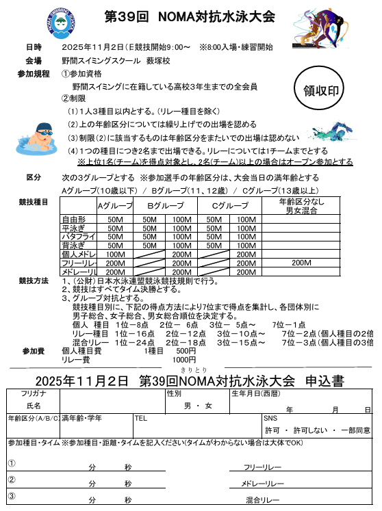2025年10月11日 / 最終更新日 : 2025年10月11日 user お知らせ こども【11/2(日)NOMA対抗水泳大会のお知らせ】 校舎対抗水泳大会!みんなで出場して盛り上がろう! FacebookCopy