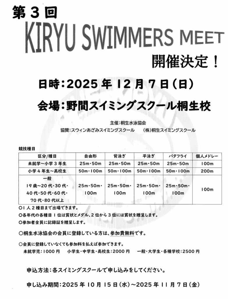 こども【12/7(日)桐生市民水泳大会のお知らせ】