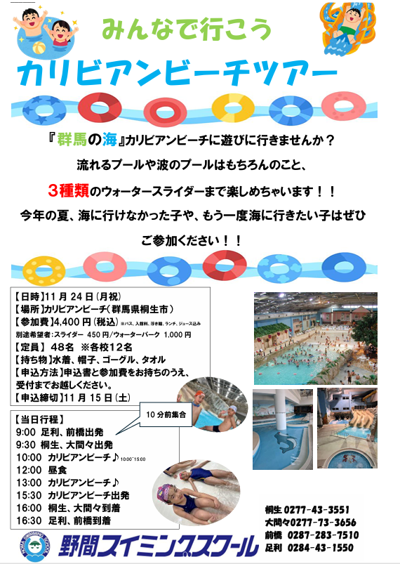 2025年10月11日 / 最終更新日 : 2025年10月11日 user お知らせ こども【11/24(月祝)カリビアンビーチツアーのお知らせ】 NOMAを飛び出して、群馬の海でみんなで遊ぼう! FacebookCopy