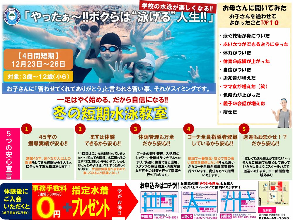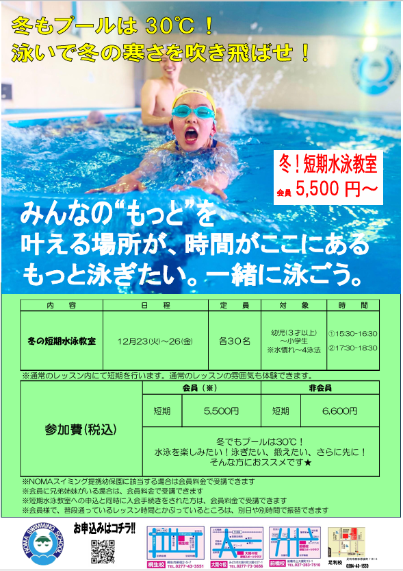 2025年10月25日 / 最終更新日 : 2025年10月25日 user お知らせ こども【冬の短期水泳教室のお知らせ】 冬でもプールは30℃!NOMAで2025年最後のレベル上げ! FacebookCopy