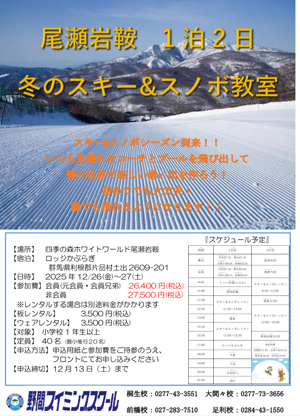2025年10月25日 / 最終更新日 : 2025年10月25日 user お知らせ こども【12/26-27 スキー&スノボ教室@尾瀬岩倉のお知らせ】 初心者から経験者まで!みんなで雪山楽しもう!! FacebookCopy