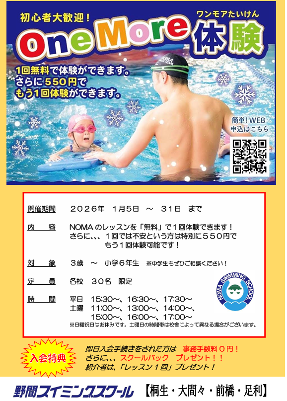 2026年1月6日 / 最終更新日 : 2026年1月6日 user お知らせ こども【新年OneMore体験&入会キャンペーンのお知らせ】 今年の抱負は何ですか?ぜひプールに挑戦!待っています 簡単!WEB申し込みはこちらから! FacebookCopy
