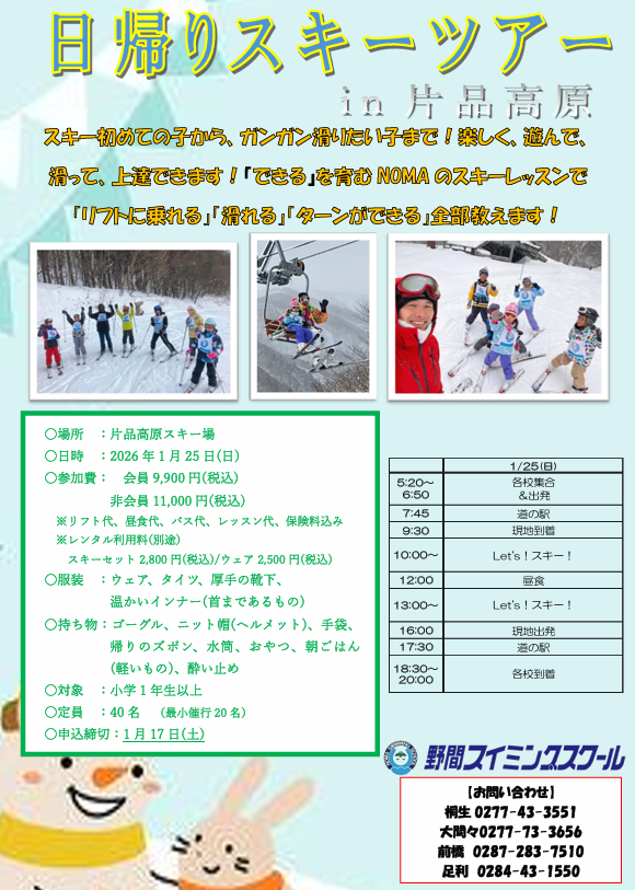 2026年1月6日 / 最終更新日 : 2026年1月6日 user お知らせ こども【1/25(日) 日帰りスキーツアー@片品高原のお知らせ】 NOMAでスキーデビュー!一緒に雪山へ行こう! FacebookCopy